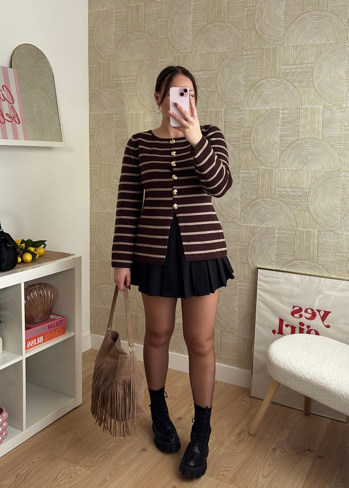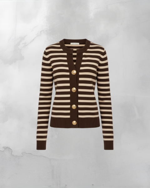 Strikket cardigan i chokoladebrune striber med gyldne knapper