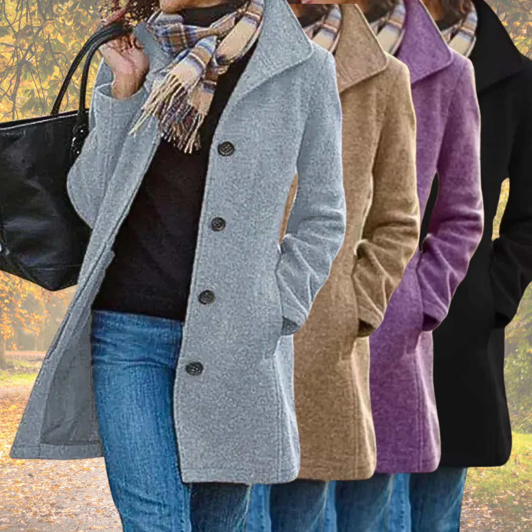 Frakken er kendetegnet ved en elegant reverskrave og en stilren, minimalistisk knaplukning, der fremhæver de slanke linjer. Den diskrete pasform smigrer silhuetten, mens de subtilt integrerede lommer ikke kun er praktiske, men også bidrager til den sømløse æstetik. Denne frakke legemliggør den perfekte balance mellem tidløs elegance og moderne sofistikation. Bær den over din yndlingsstrik for et casual-chic look, eller kombiner den med skræddersyede bukser og hæle for et upåklageligt kontoroutfit eller aftenlook. Et investeringsstykke, der forbliver relevant sæson efter sæson.