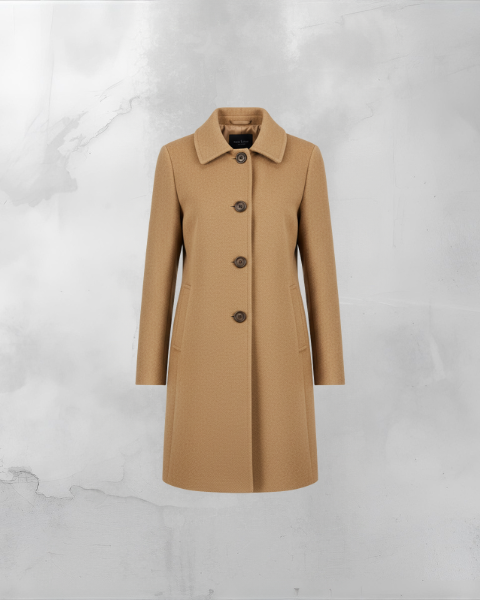 Omfavn ubesværet chic med denne raffinerede camel-farvede frakke, en absolut must-have til enhver moderne garderobe. Dette klassiske single-breasted design er mesterligt udført i en luksuriøs uldblanding, som sikrer både en sublim touché og behagelig varme på køligere dage.
