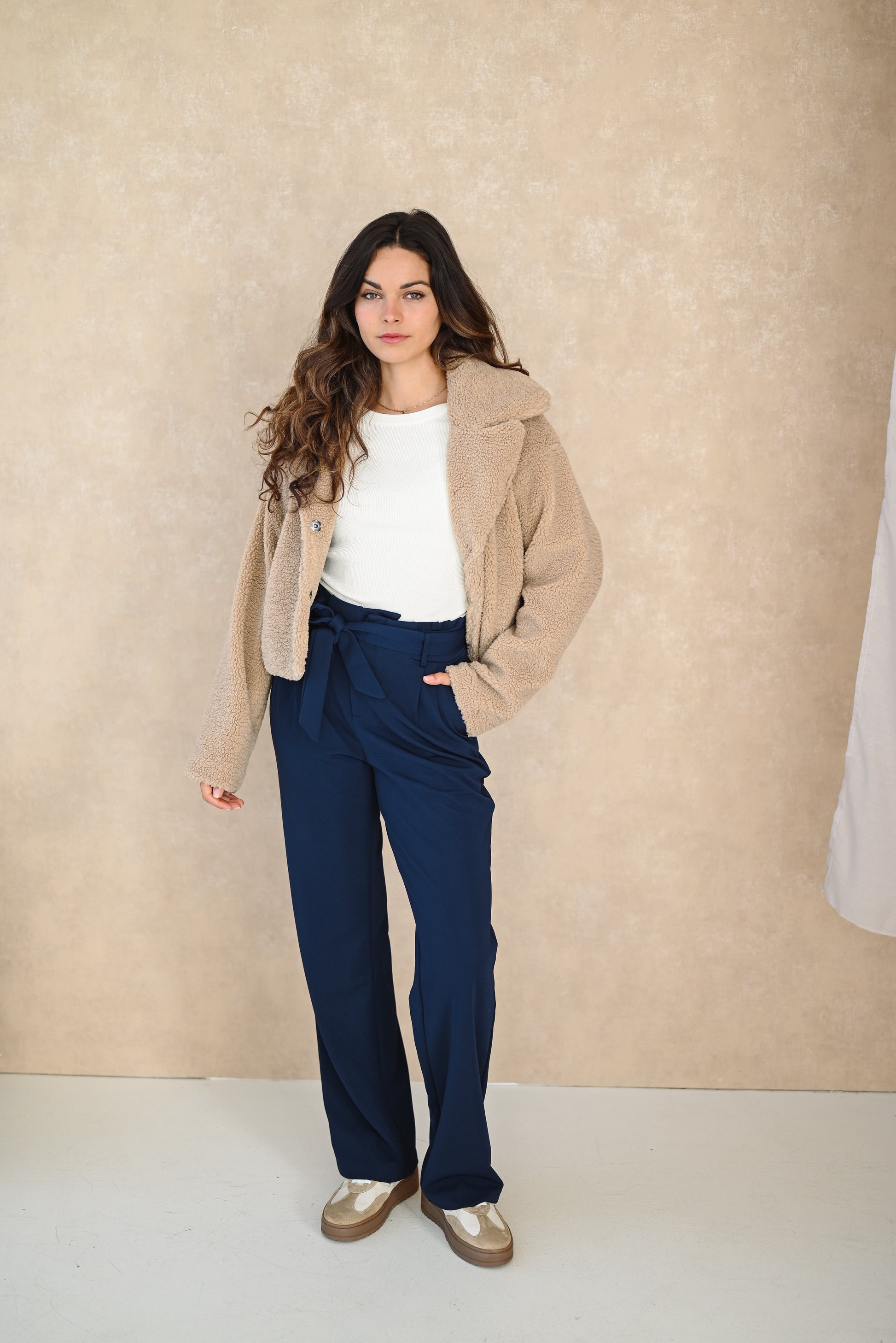 Stylet med: SHIRLEY TOP ECRU og AUDREY BUKSER NAVY og ANEMONE SNEAKER SAND/CRÈME fra OMAT JEANS NEDERDEL BLUE og FAY STØVLER BLACK