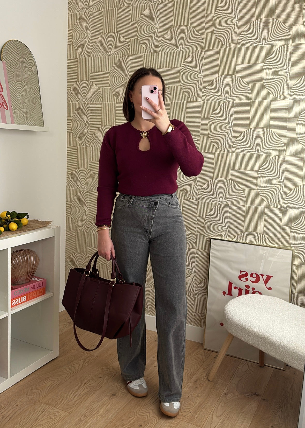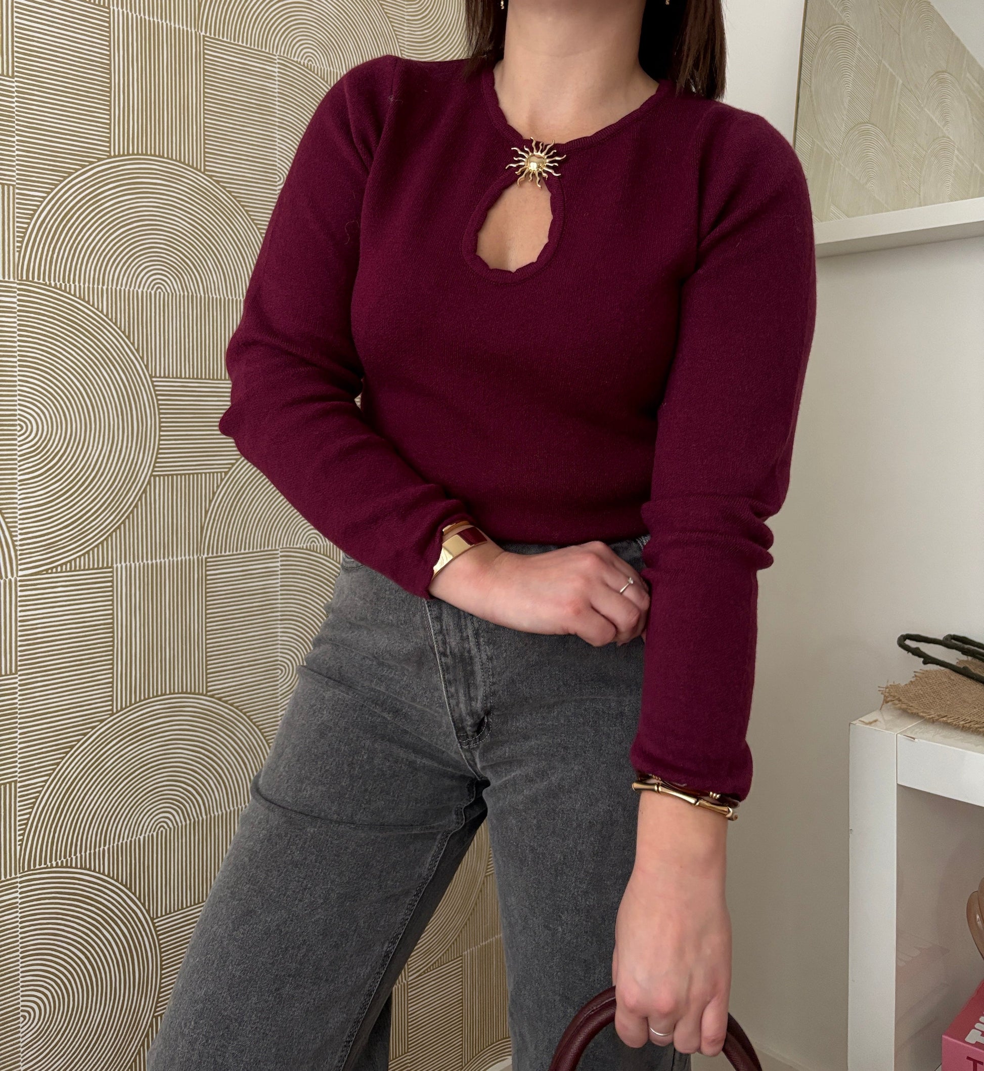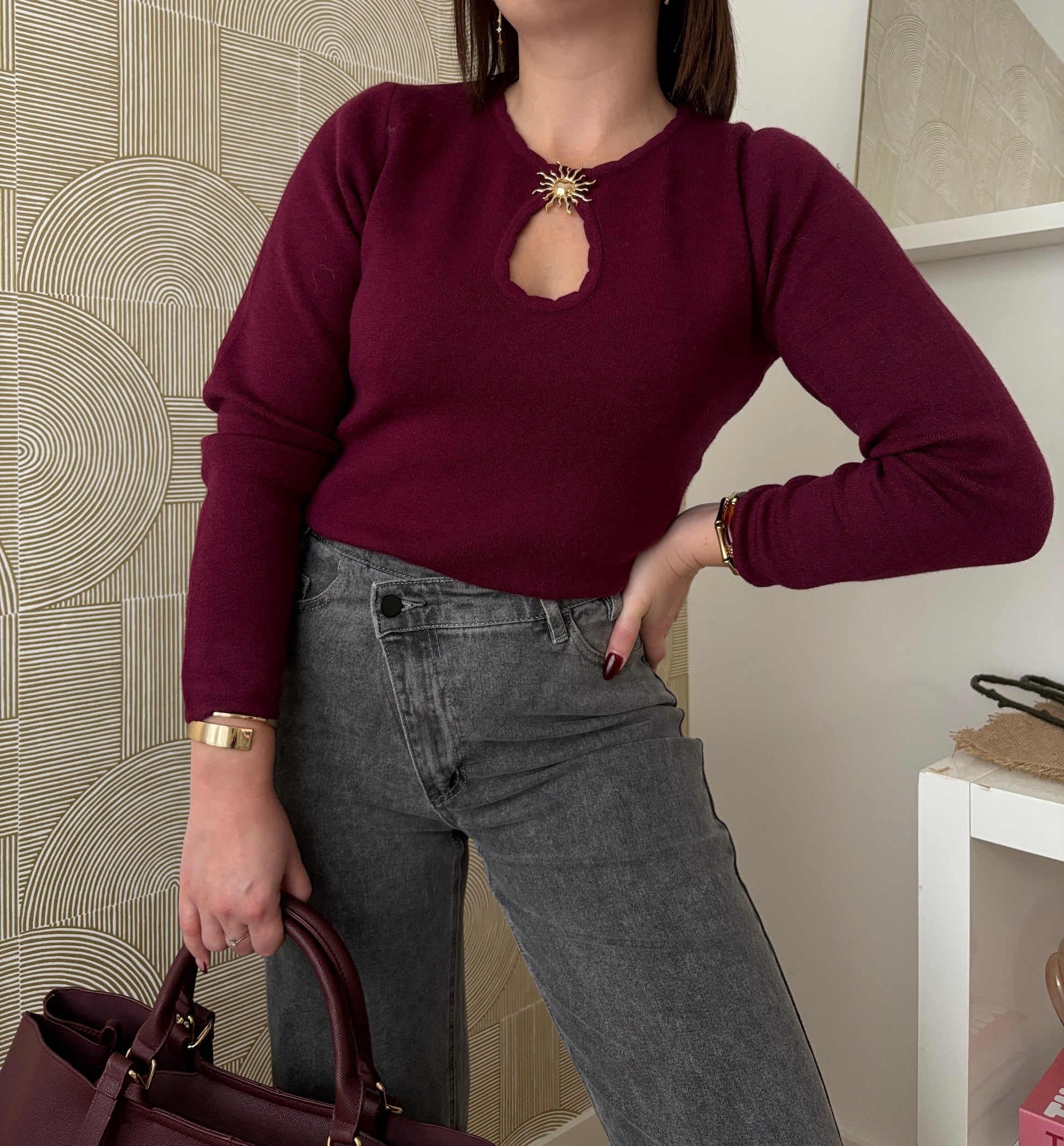 Denne bordeaux trøje har en tæt pasform, blødt og elastisk strik samt et subtilt guldsmykke ved halsen, der giver et stilfuldt touch. Kan nemt styles med både jeans og nederdel.