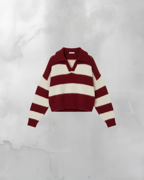 Denne let oversized strik har en åben, let V-hals og brede striber i bordeaux og ecru. Kan styles med plisseret nederdel, jeans eller bukser for et afslappet-chic look.