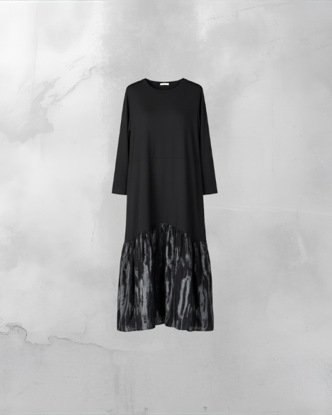 Denne løstsiddende maxi T-shirt kjole er din efterårs- og vinterfavorit. Udført i en blød bomuldsblanding, kombinerer den en afslappet rund hals og dropped shoulder ærmer med et iøjnefaldende print og uregelmæssige materialedetaljer i sømmen. Perfekt til hverdagsbrug, hvor komfort møder moderne stil.