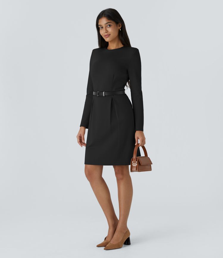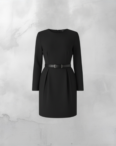 Elegant sort midikjole med flatterende V-udskæring og lange ærmer. Den brede, taljebetonende bælte med guldfarvet spænde sikrer en struktureret pasform. Skørtet har flydende plisseringer, der skaber et dynamisk A-snit. Perfekt til både formelle lejligheder og stilfulde aftener.