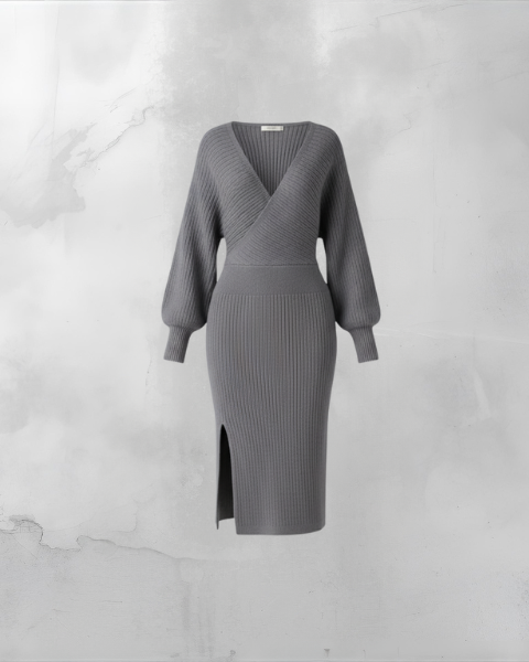 Omfavn sæsonen med denne luksuriøse, grå strikkede midikjole. Det flatterende wrap-design med dyb V-hals og voluminøse lange ærmer kombinerer komfort og elegance. Den tætsiddende, ribstrikkede nederdel med sideslids sikrer et moderne og sofistikeret look. Perfekt til enhver lejlighed, hvor hygge møder chik stil.
