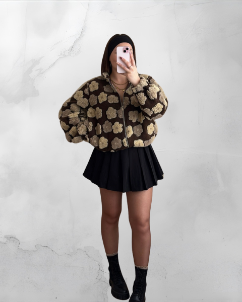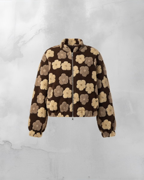 Denne jakke har fleurige reliefmotiver, et ultra-blødt “doudou”-materiale og en let oversized pasform. Kan styles åben med jeans eller lukket med plisseret nederdel.